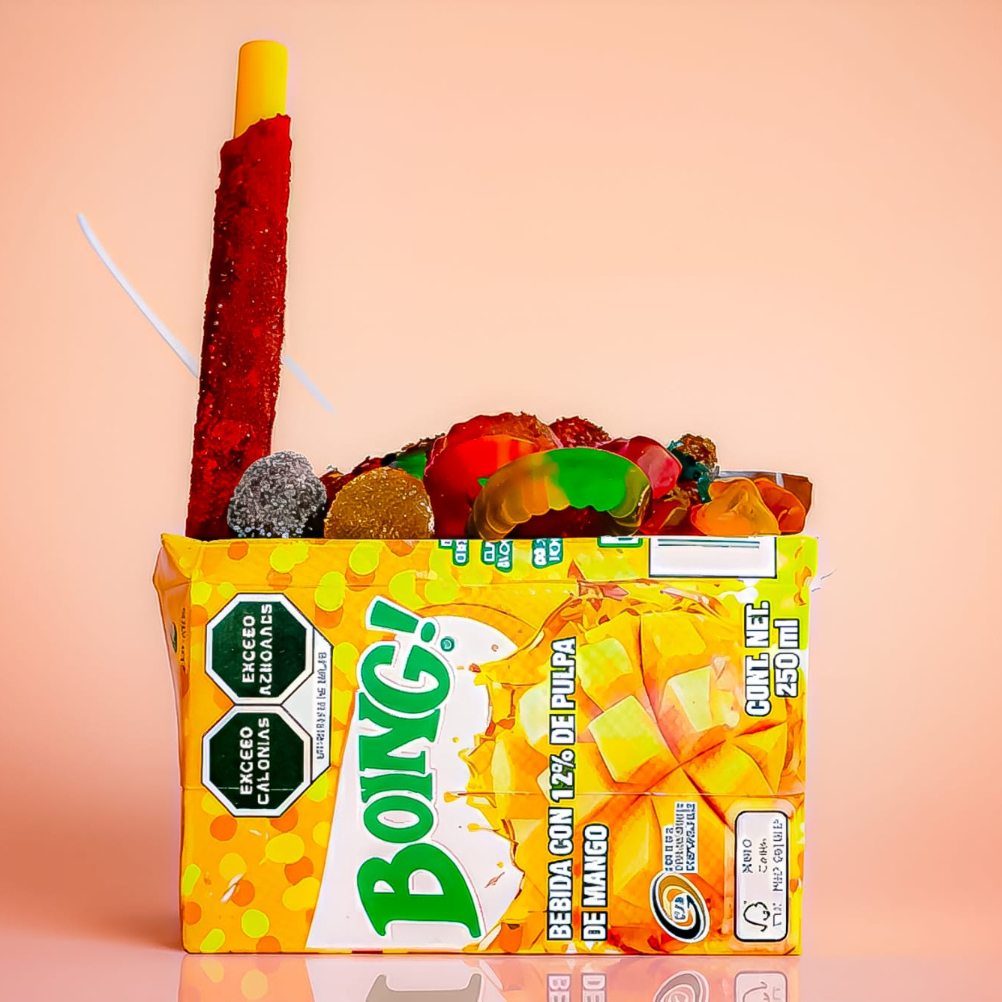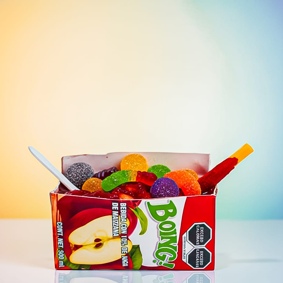 Boing preparado con tus toppings preferidos y popote de tamarindo para coronar. Acompañado de chile y chamoy al gusto