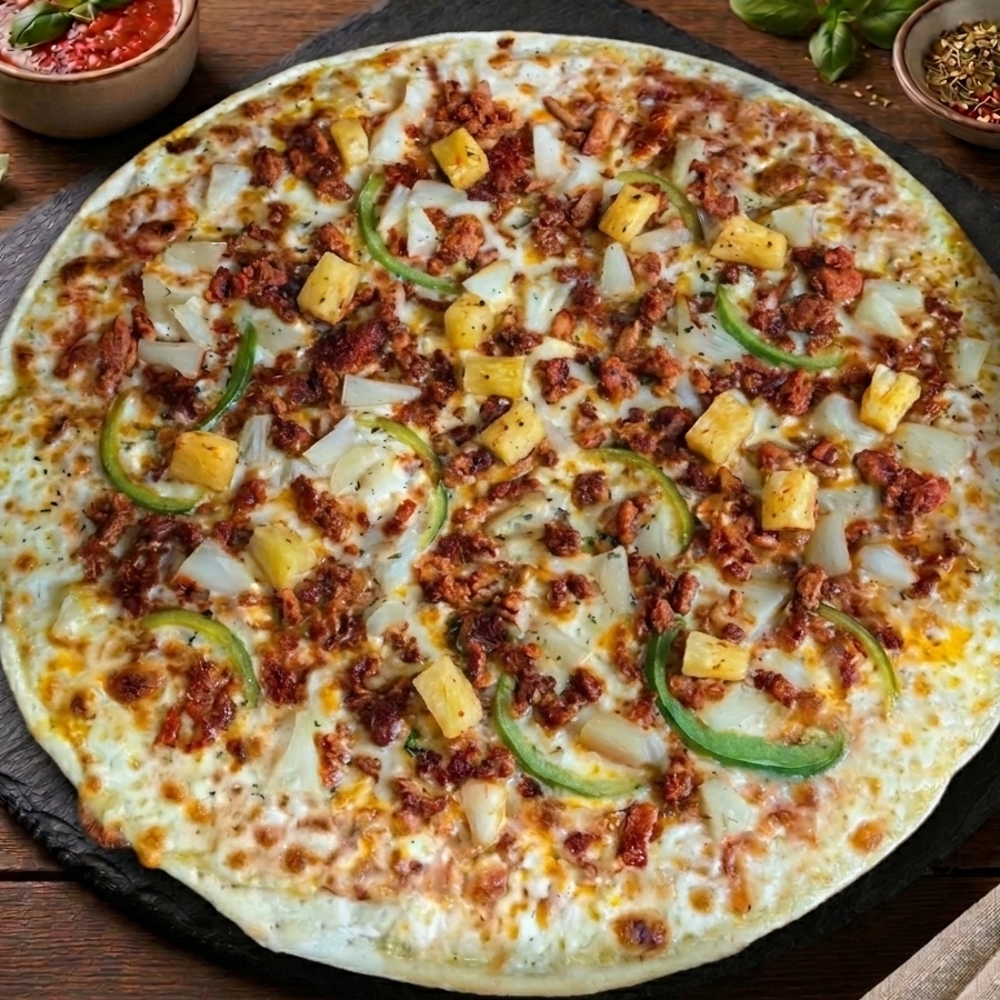 Pizza de 36 cm. Con piña, pimiento, cebolla, carne al pastor y una capa generosa de queso mozzarella calidad premium.