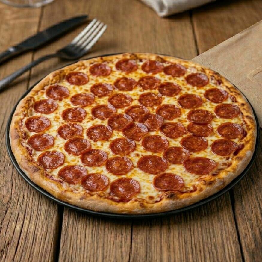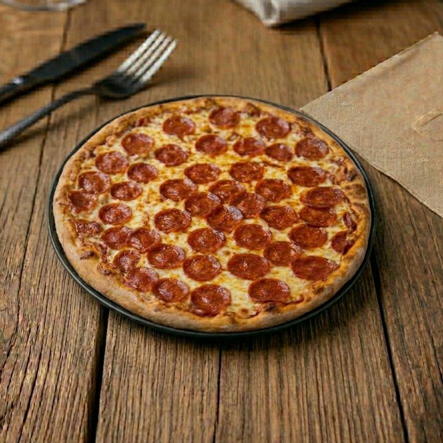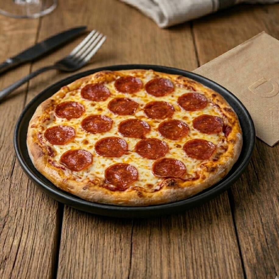Pizza de 30 cm. Con pepperoni, champiñones, pimiento y una capa generosa de queso mozzarella calidad premium.