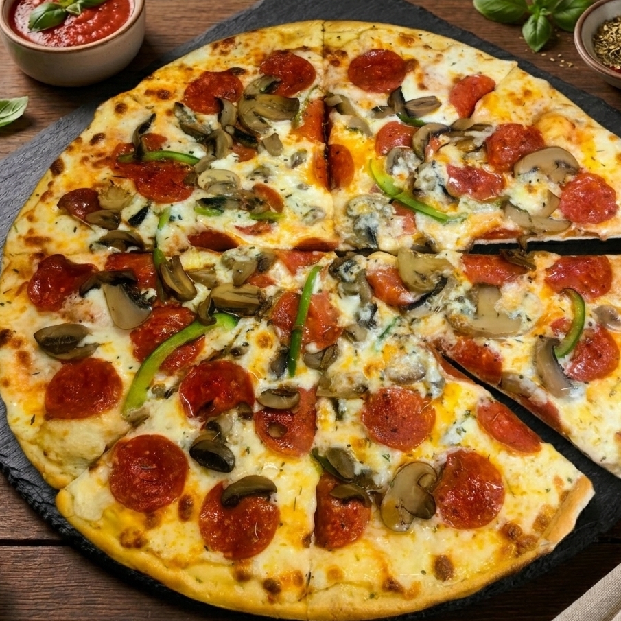Pizza de 41 cm. Con champiñones, salami, chilorio, salchicha y una capa generosa de queso mozzarella calidad premium.