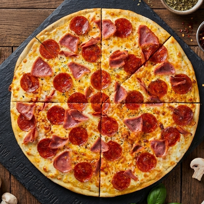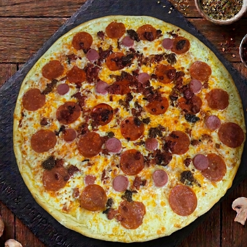 Pizza de 36 cm. Con pepperoni, salami, jamón y una capa generosa de queso mozzarella calidad premium.