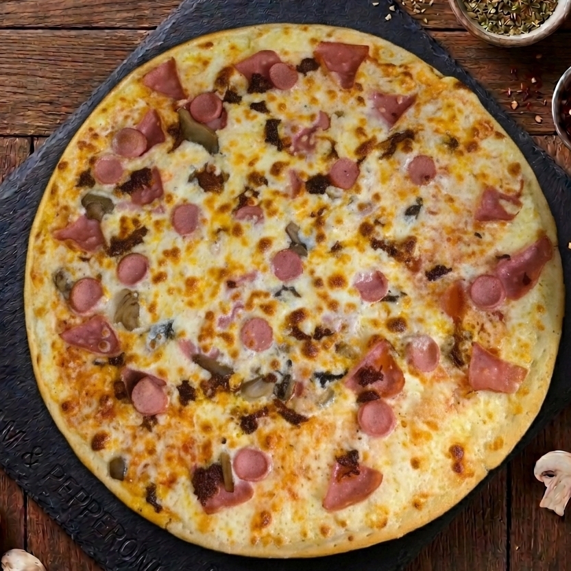 Pizza de 36 cm. Con champiñones, salami, chilorio, salchicha y una capa generosa de queso mozzarella calidad premium.