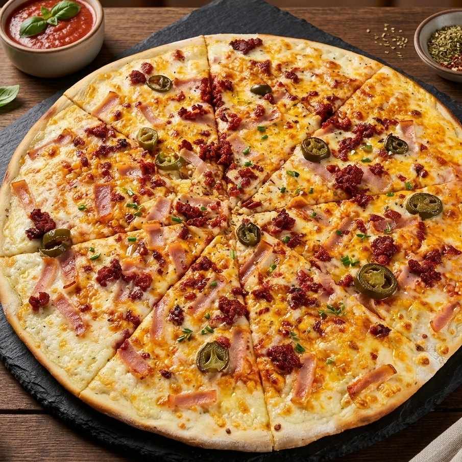 Pizza de 36 cm. Con chorizo, jalapeño, tocino y una capa generosa de queso mozzarella calidad premium.