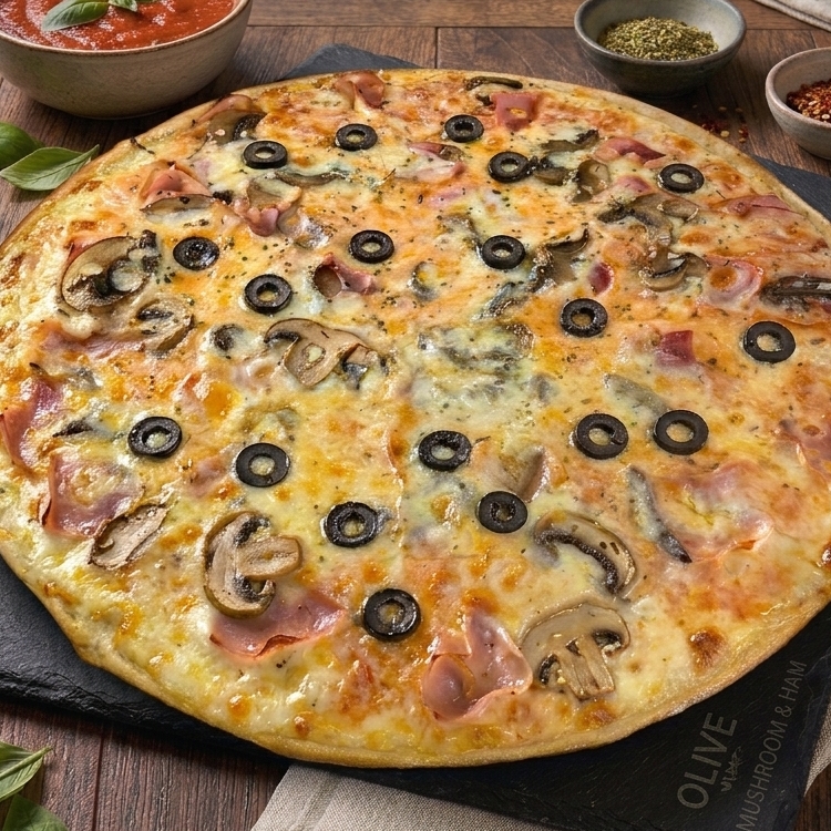 Pizza de 30 cm. Con jamón, champiñones, aceitunas y una capa generosa de queso mozzarella calidad premium.