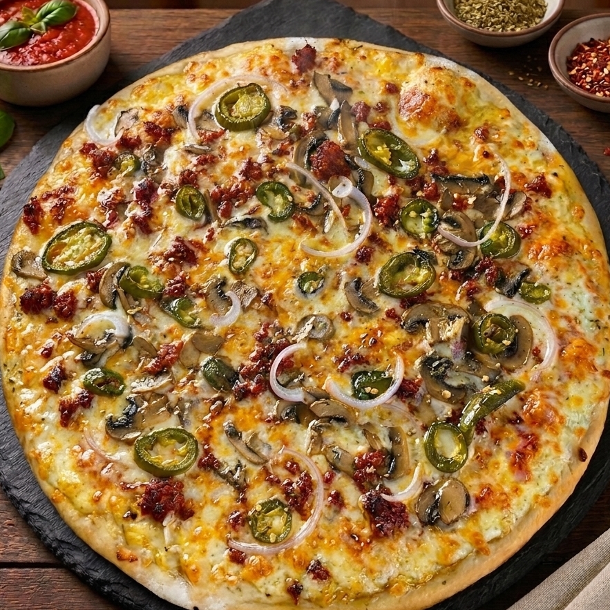 Pizza de 36 cm. Con chorizo, champiñones, cebolla, jalapeño y una capa generosa de queso mozzarella calidad premium.