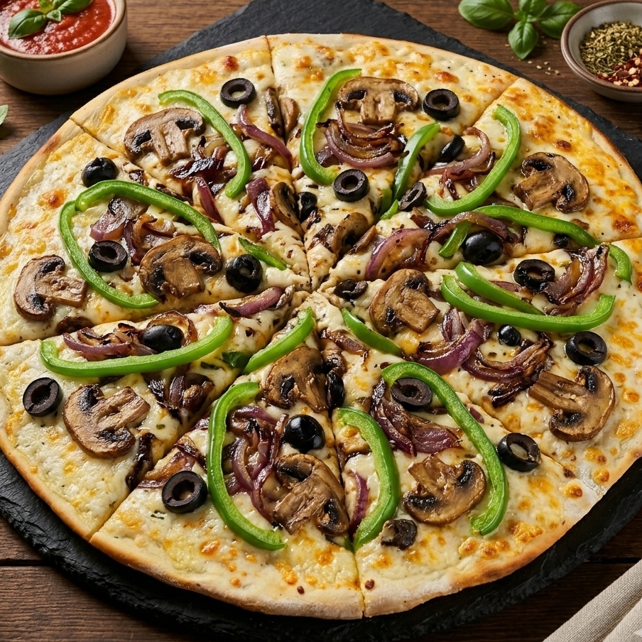 Pizza de 36 cm. Con champiñones, pimiento, cebolla, aceitunas y una capa generosa de queso mozzarella calidad premium.