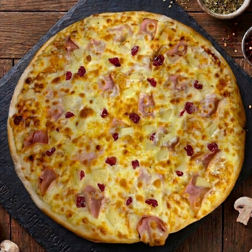 Pizza de 30 cm. Con jamón, piña, cereza y una capa generosa de queso mozzarella calidad premium.