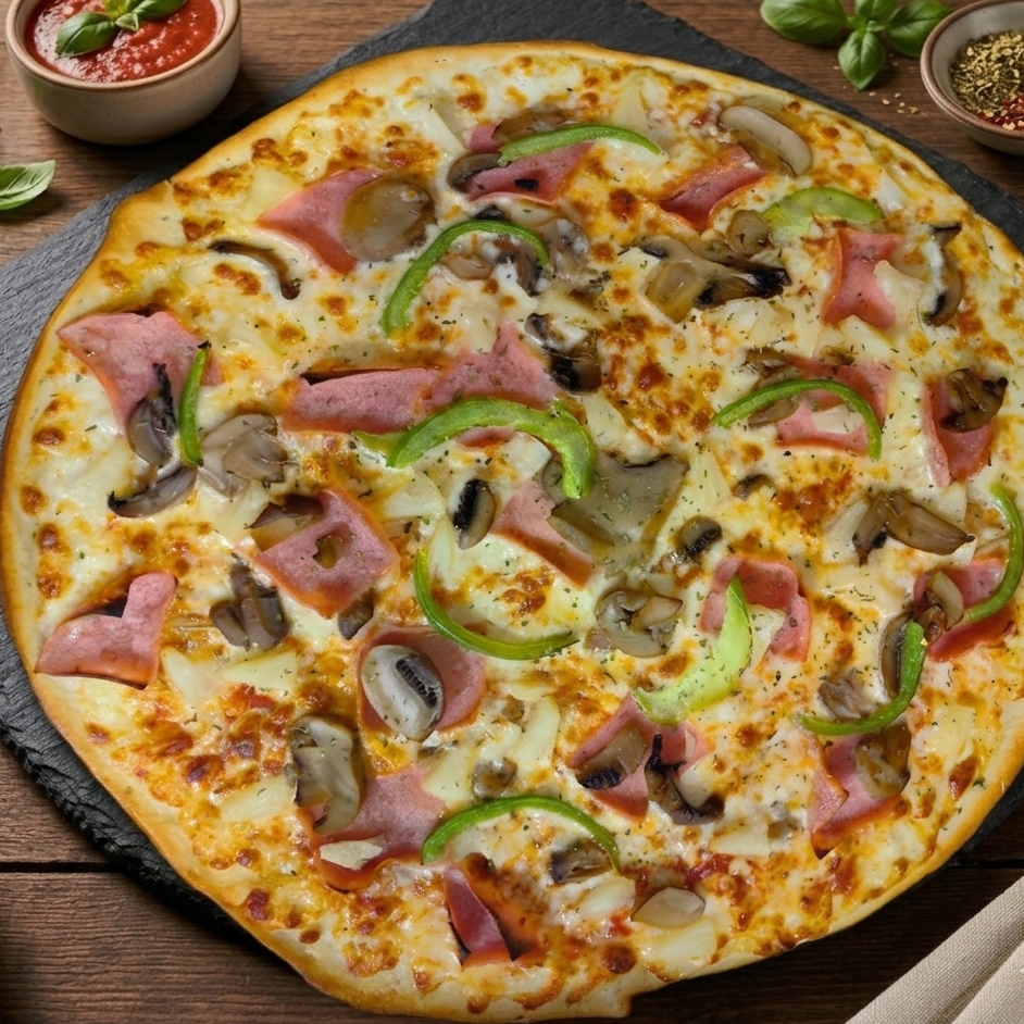 Pizza de 41 cm. Con jamón, piña, champiñones, pimiento y una capa generosa de queso mozzarella calidad premium.