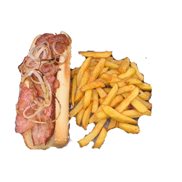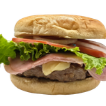 Carne de res, Jamón, Queso manchego, Pan Brioche, Lechuga, Jitomate, Cebolla, aderezo de la casa y Papas a la Francesa