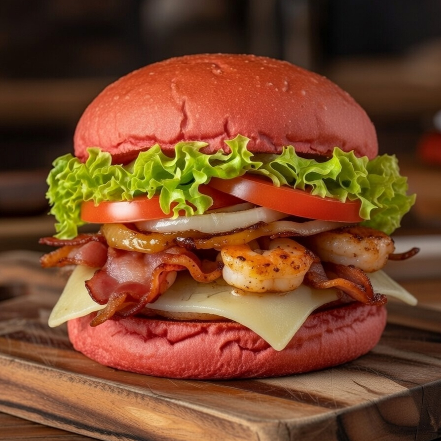 Camarones, Tocino, Aguacate, Queso Manchego, Lechuga, Jitomate, Cebolla, aderezo de la casa y Papas a la Francesa
