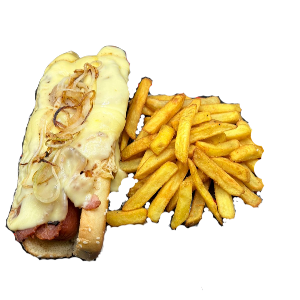 Pan grande, Salchicha Jumbo de pavo, Cebolla caramelizada y Queso manchego