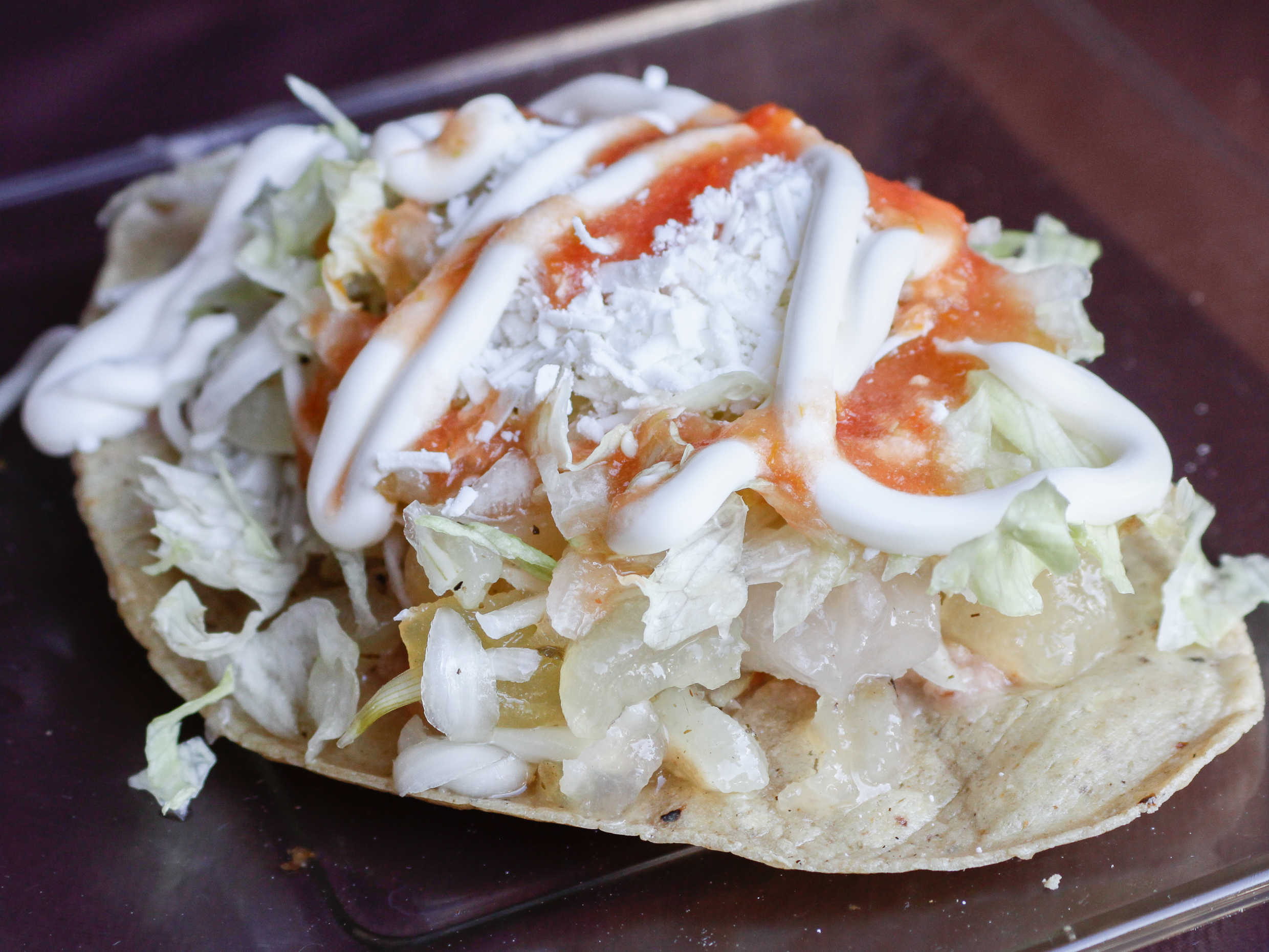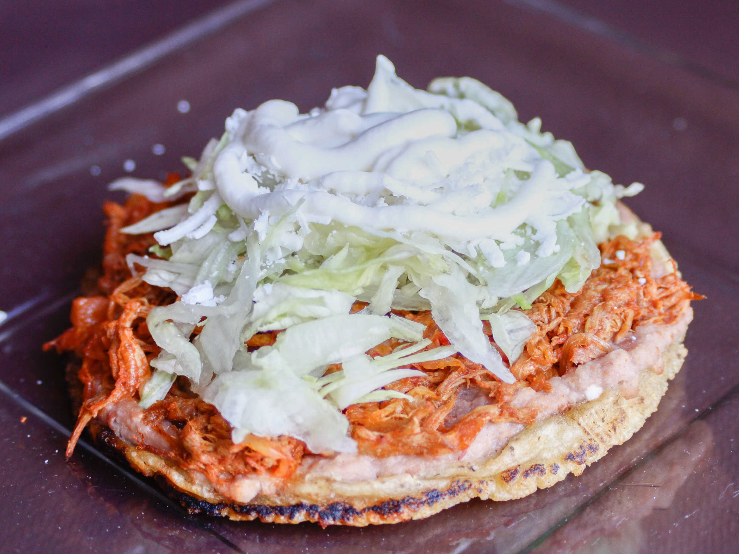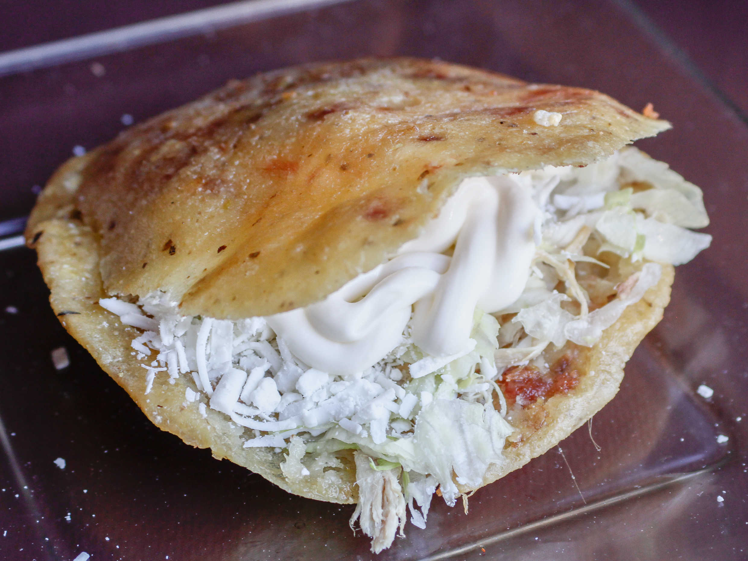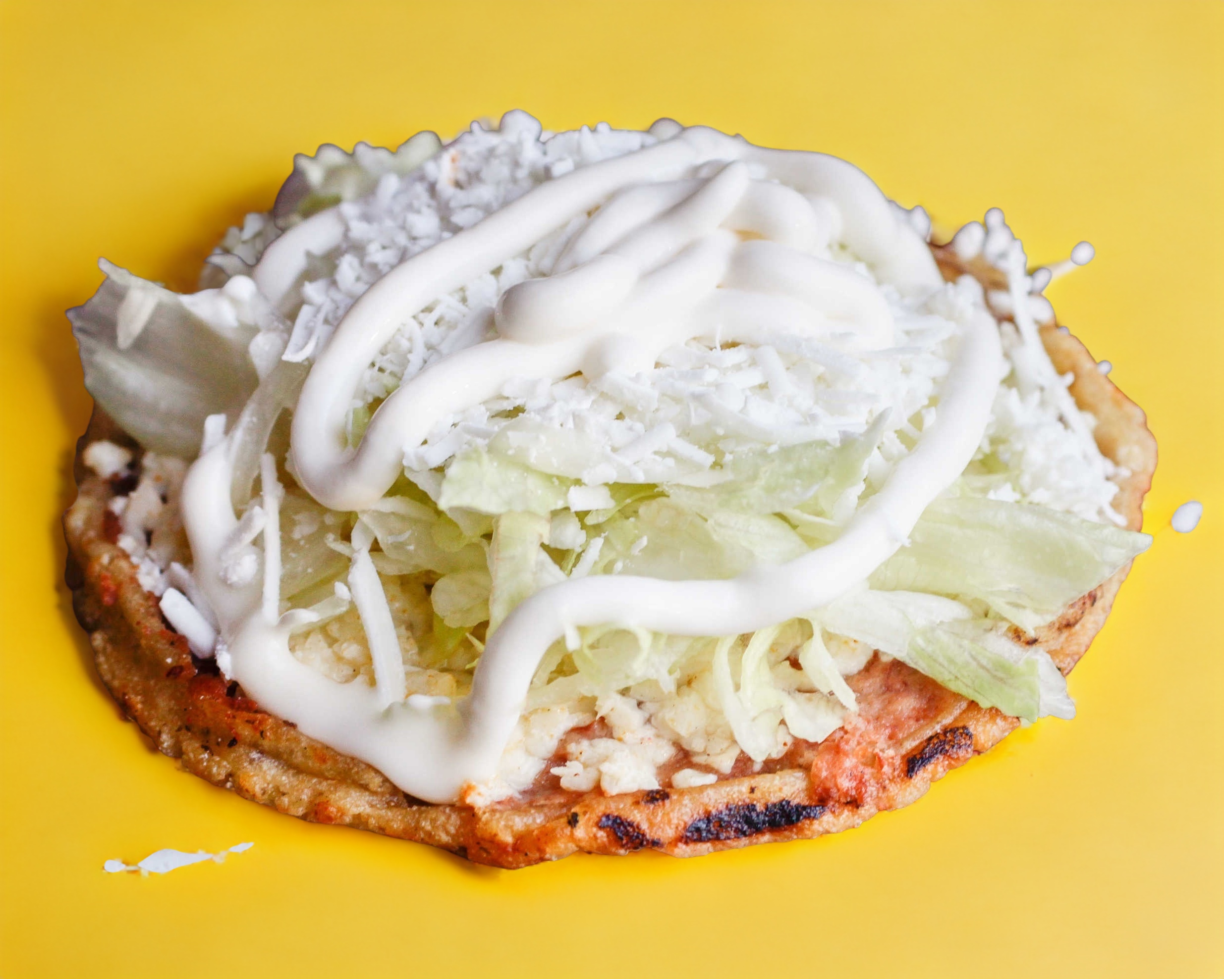 Chicharrón prensado, queso rallado, crema y lechuga.