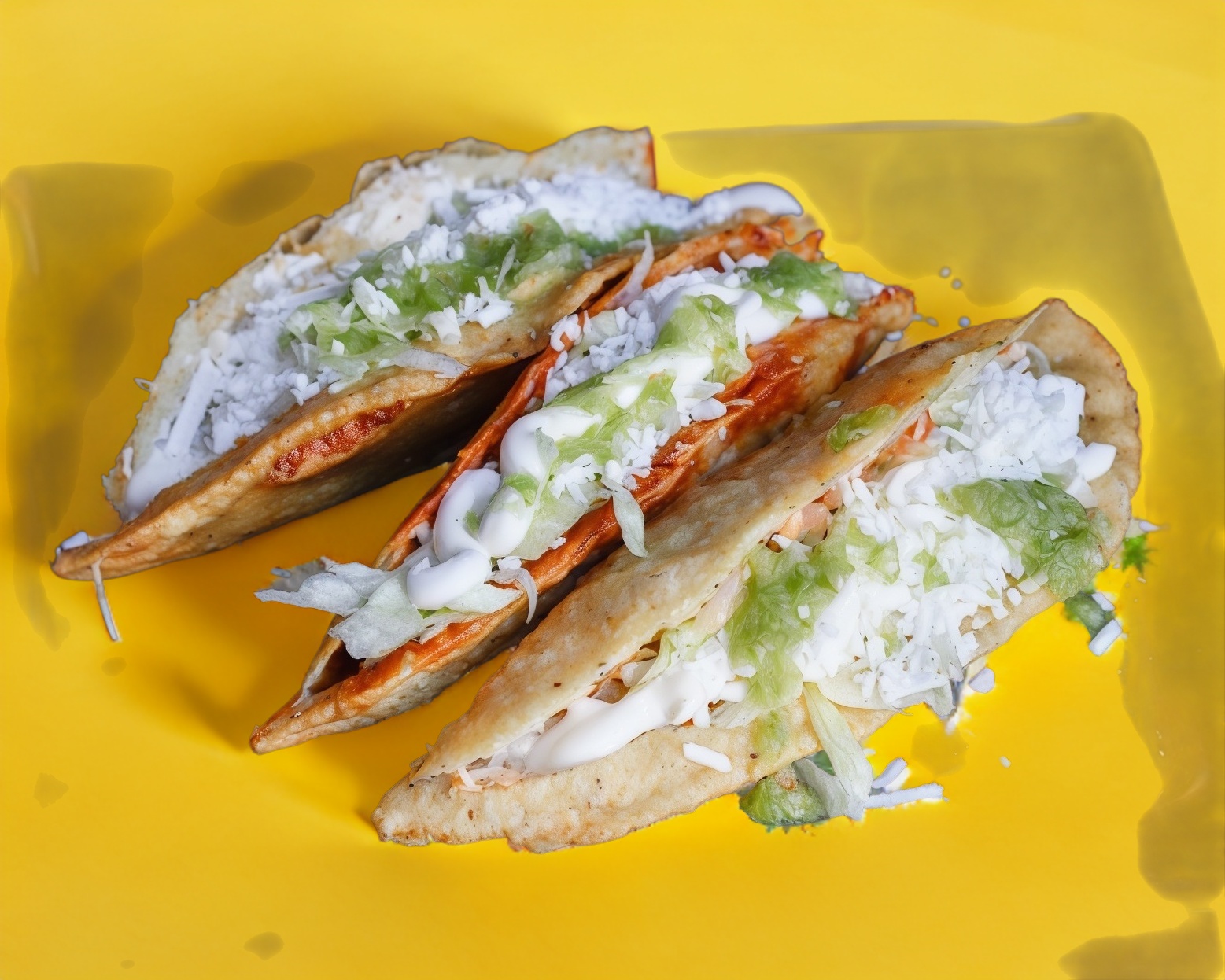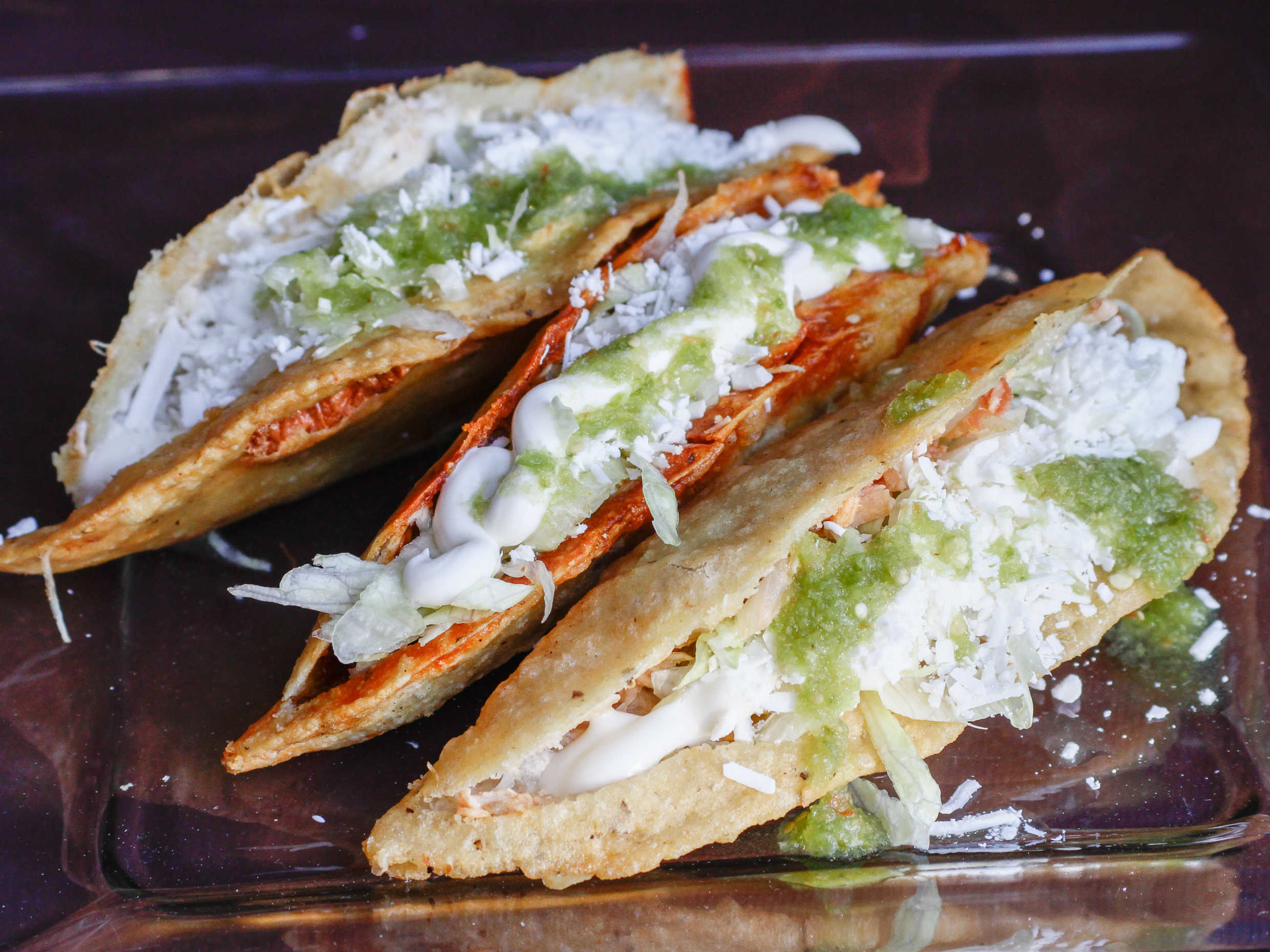 Pollo, jitomate, cebolla, orden de tres piezas preparados con lechuga, queso rallado y crema.