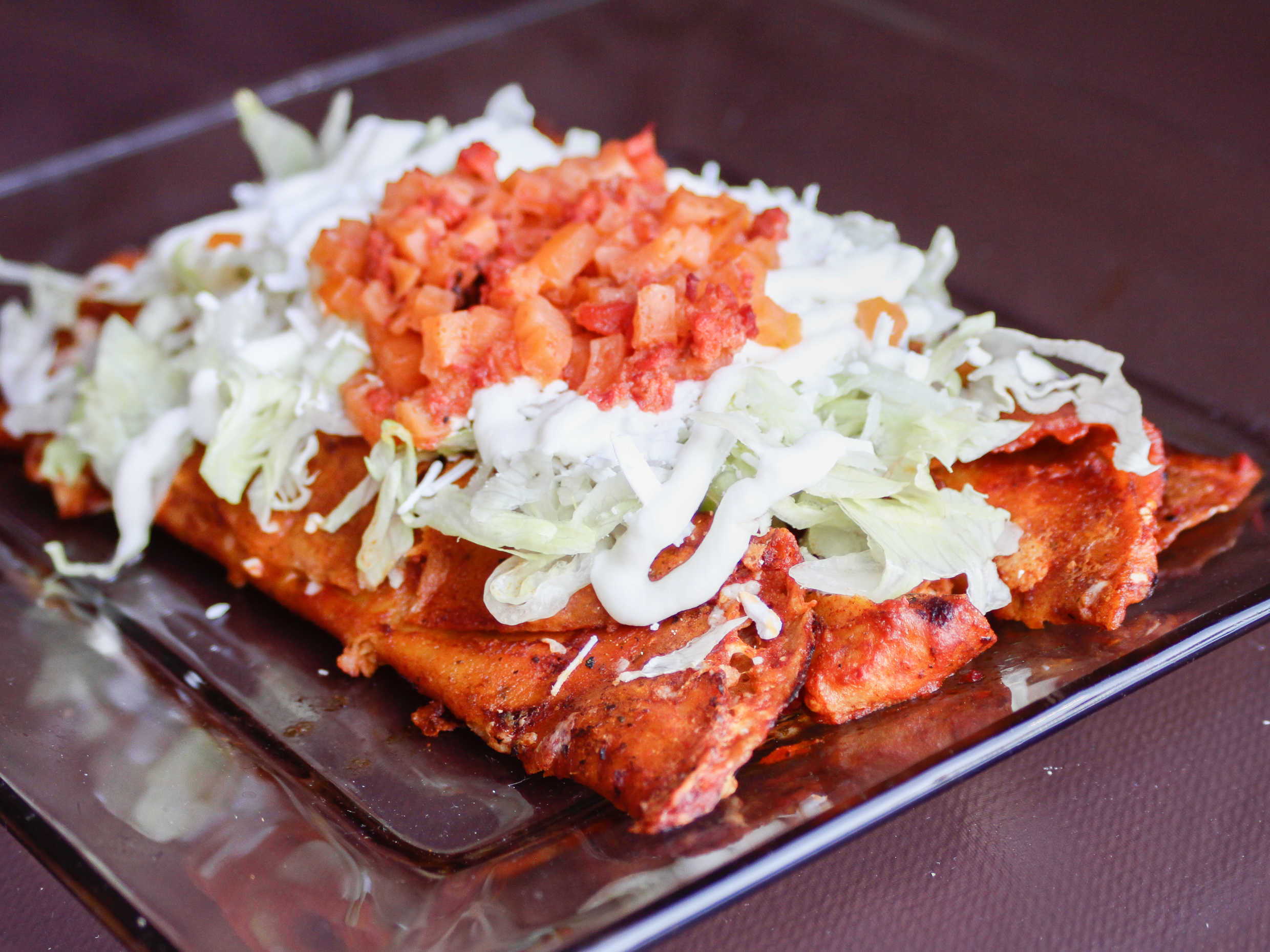 Pollo enchilado, lechuga, queso y crema.