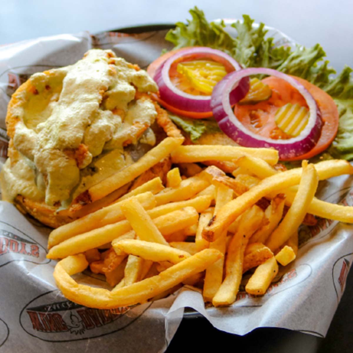 227 gr de carne condimentada cubierta de queso pepper jack derretido y cebollas crujientes, con una salsa picante de crema de chile verde. Incluye papas fritas