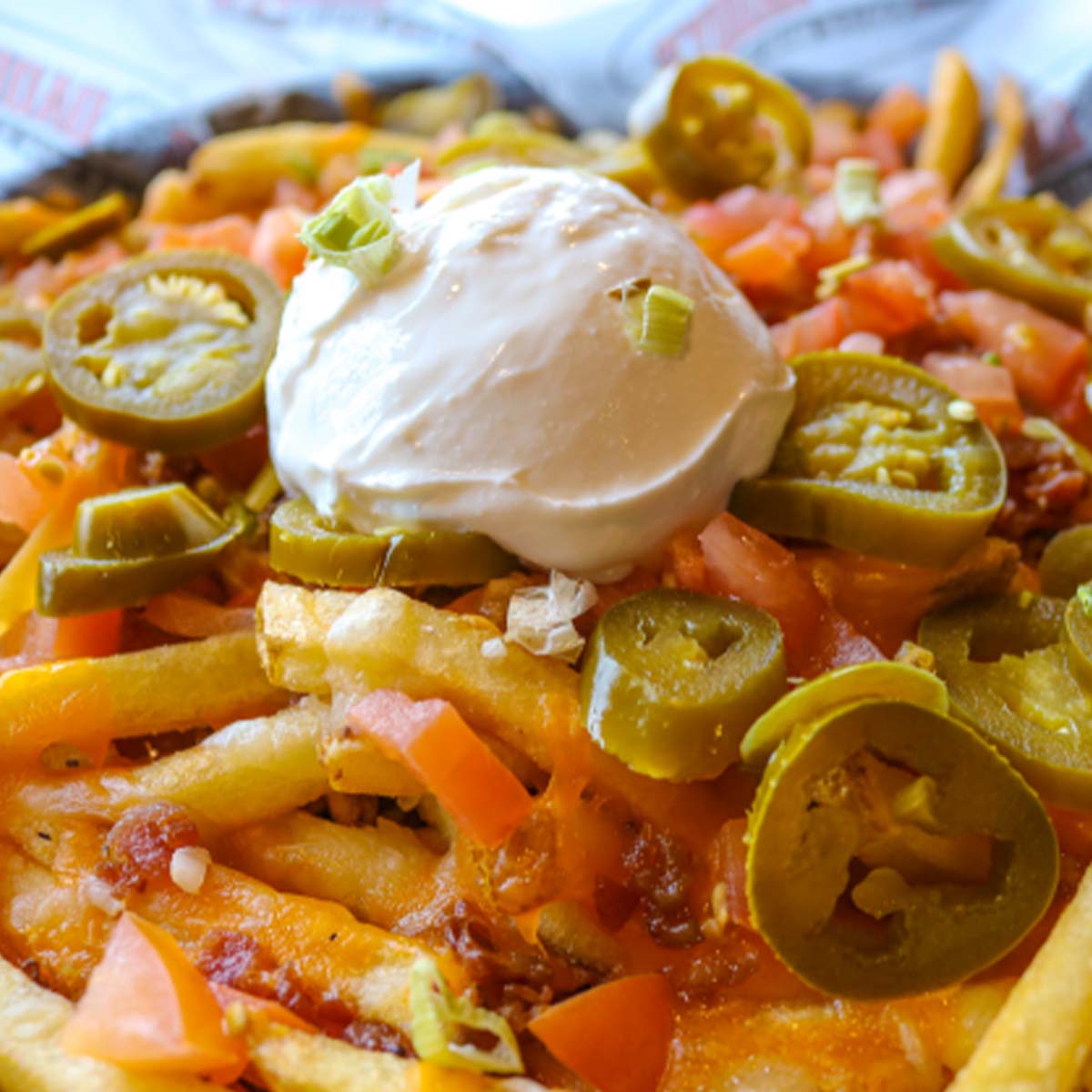 Ricas y crujientes papas bañadas a la perfeccion con queso jack y queso cheddar rallado y acompañadas de muchos ingredientes deliciosos: jalapeños, cebolla, tomate picado, trocitos de tocino y una cucharada de crema