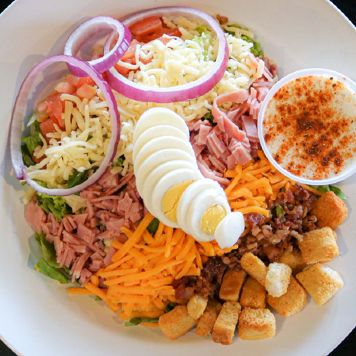 200 gr mezcla de lechuga romana, queso cheddar, tocino, tiras de pachuga de pavo y trocitos de hevo cocido y jamon