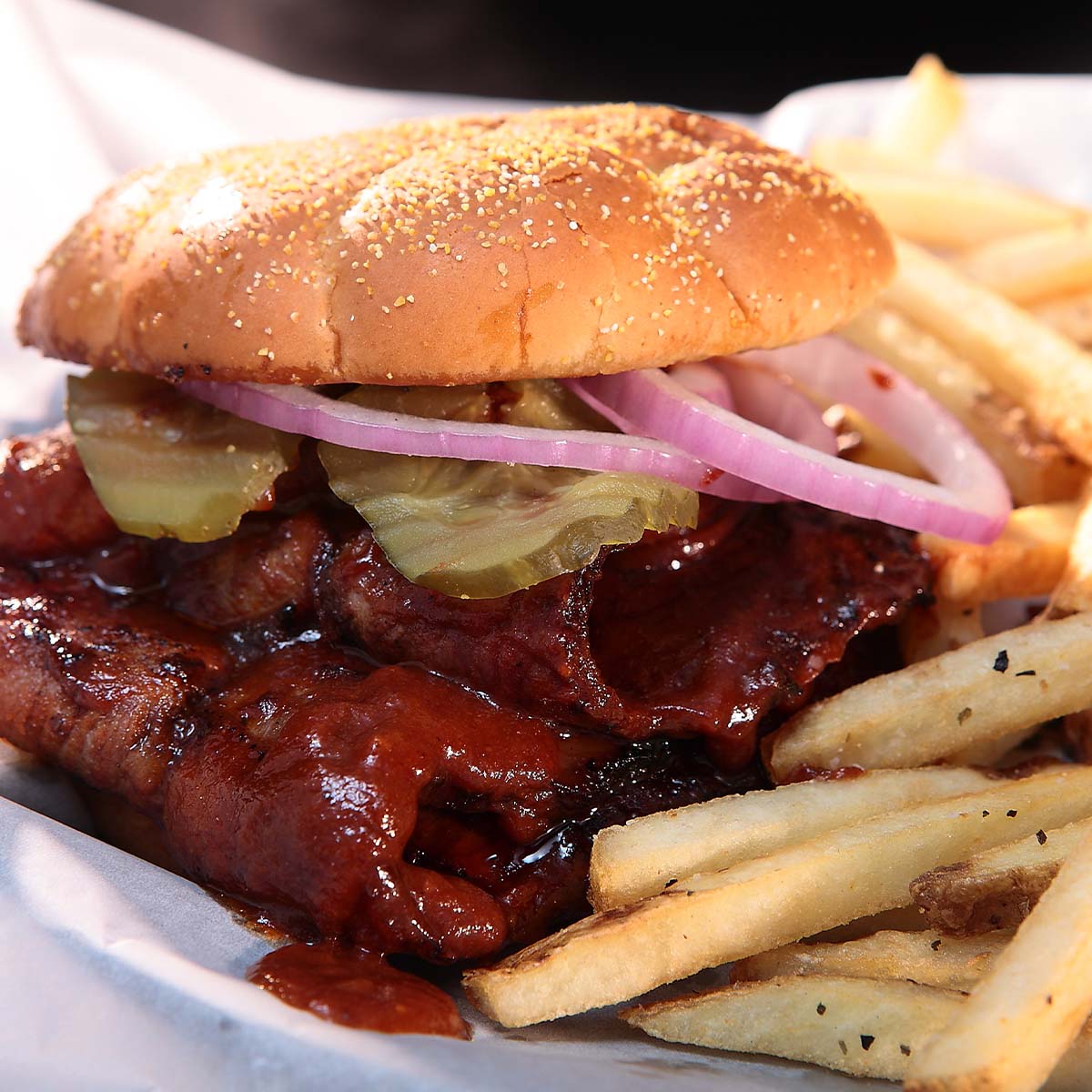 200 gr de tiras de brisket ahumado y calientito dentro de un pan kaiser y bañado en cualquiera de las 3 salsa Bbq que tenemos, elige la mas te guste: honey bbq, flaming bbq o la original bbq. Incluye papas fritas