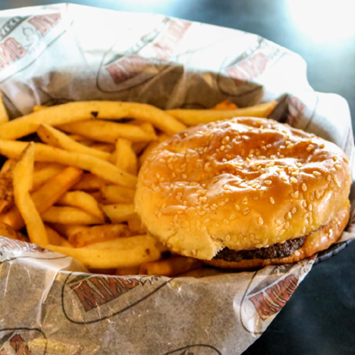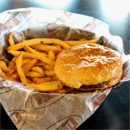 1/2 libra (227 gr) de carne de hamburguesa sazonada con nuestra salsa secreta Bbq, cubierta con queso provolone y delicioso tocino ahumado. Incluye papas fritas