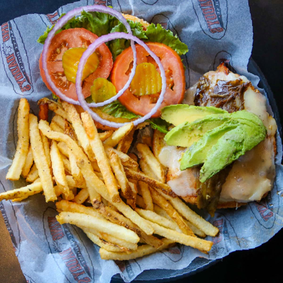 227 gr de pechuga de pollo a la parrilla sazonada a la perfeccion cubierta de aguacate fresco y chile california. Incluye papas fritas