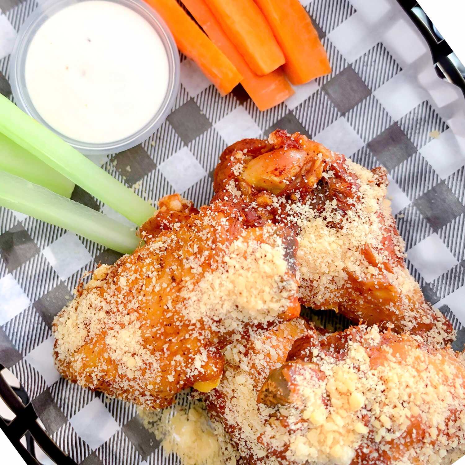 8 alitas grandes bañadas en tu salsa favorita, aderezo de la casa y bastones de apio.