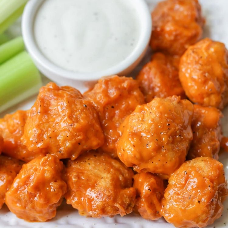 8 boneless bañados en la salsa de su elección acompañados de aderezo de la casa y apio.