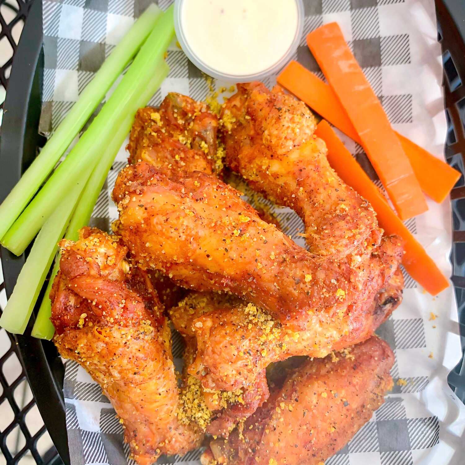 6 alitas grandes bañadas en tu salsa favorita, aderezo de la casa y bastones de apio.