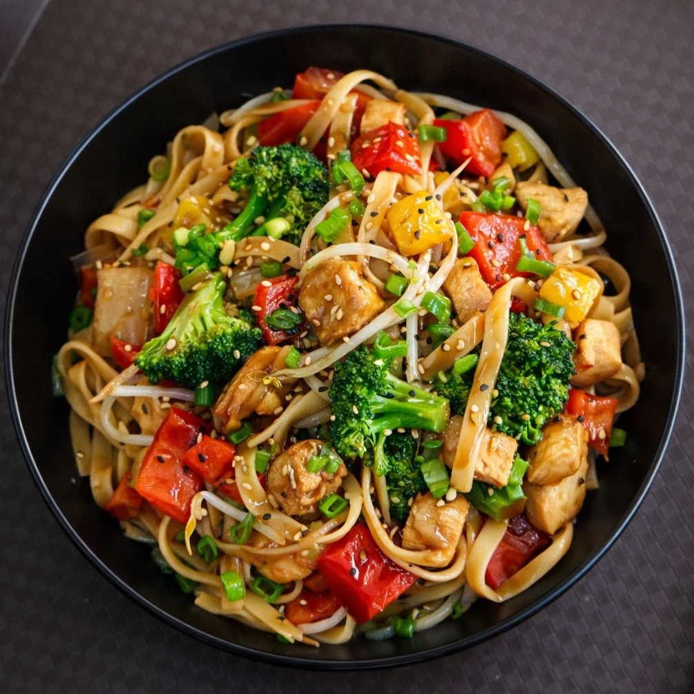 Tallarines con Pollo, pimientos, brócoli, piña y germen de soja
