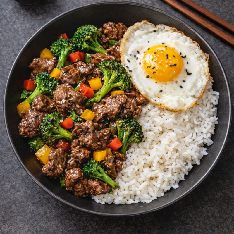 Inspiración Tailandesa; Salteado de carne con albahaca, brócoli y pimientos en cama de arroz blanca coronado de huevo frito