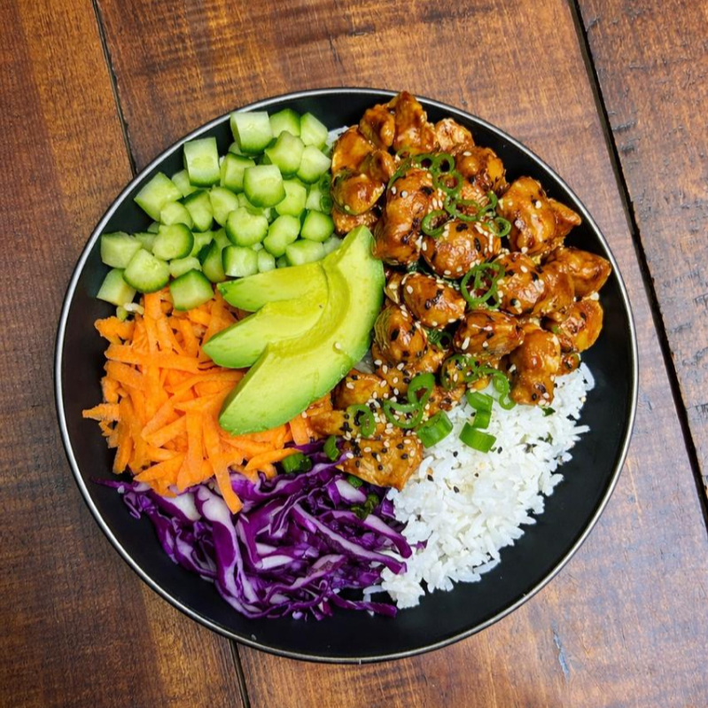 Pollo salteado en salsa Teriyaki, arroz blanco, zanahoria rayada, pepino, col morada, aguacate.
