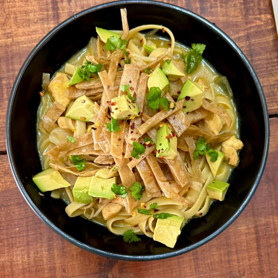 Tallarines, pollo curry tailandés, leche de coco, aguacate, tortilla frita, cilantro