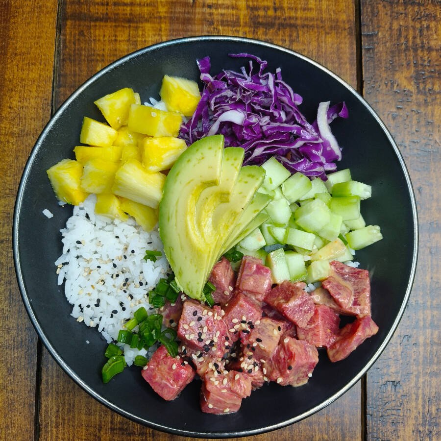Arroz blanco, atún fresco marinado, pepino, col morada, piña y aguacate.