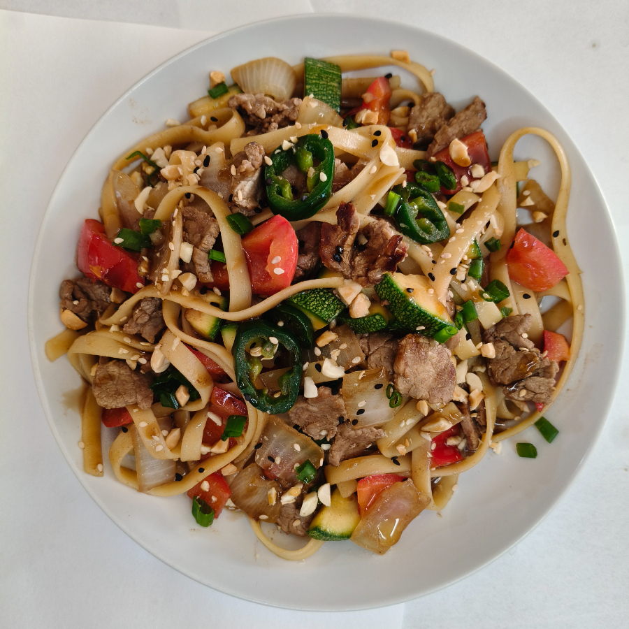 Tallarines con carne de res, pimientos, cebolla, calabaza, jalapeño y cacahuates.