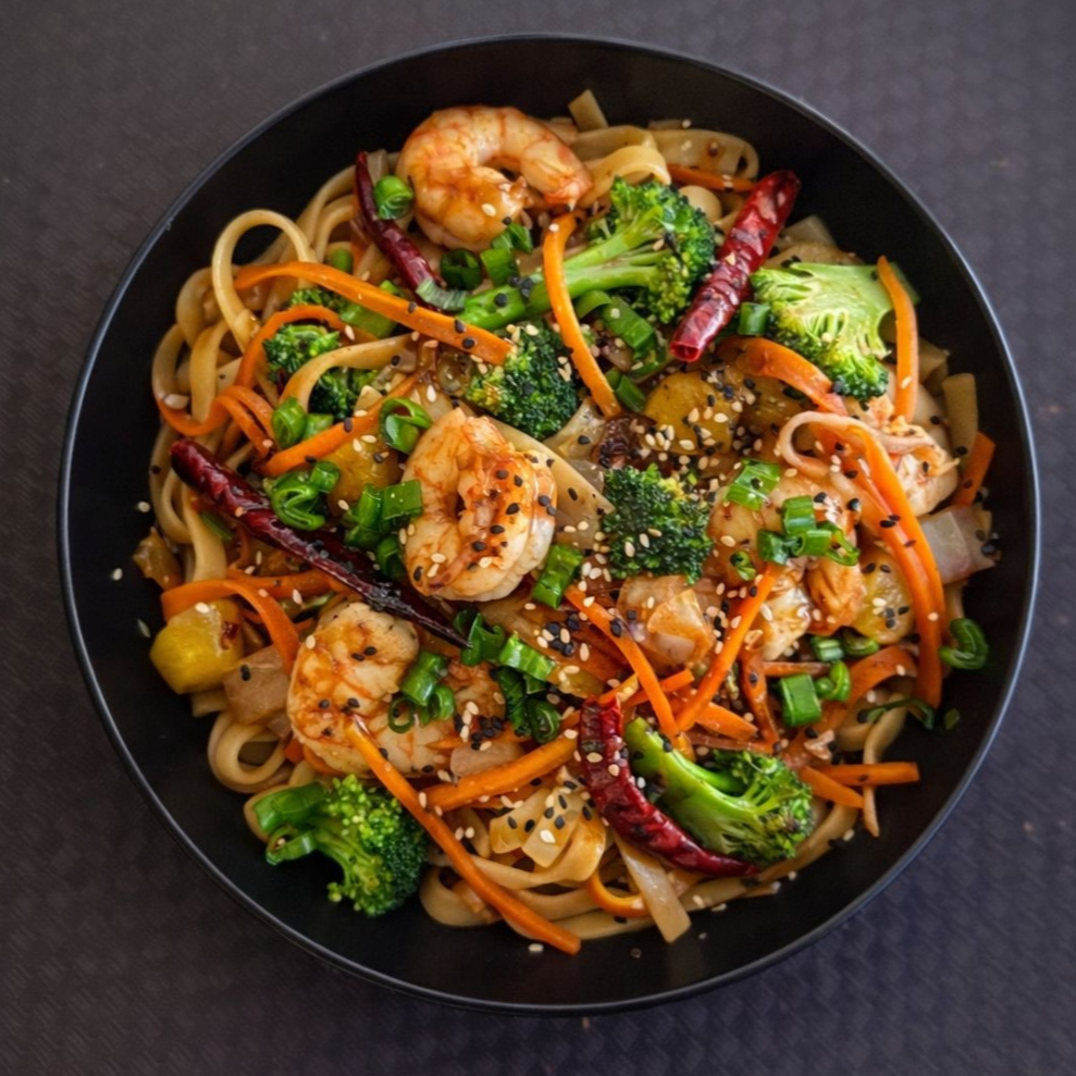 Tallarines con camarones, zanahoria, cebolla, brócoli, piña y chile de árbol.