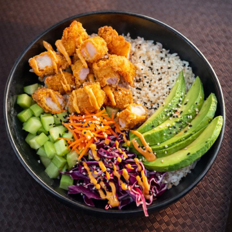 Camarones empanizados, arroz blanco, col morada, pepino, zanahoria y aguacate.