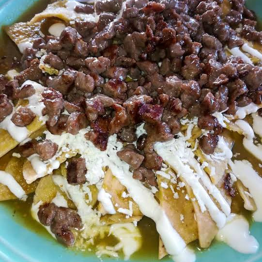 Chilaquiles verdes •queso •crema •frijoles •bolillo •arrachera