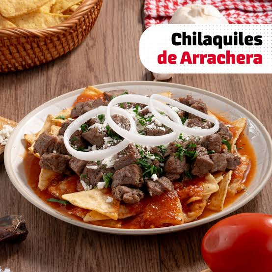 Chilaquiles rojos •queso •crema •frijoles •bolillo •arrachera