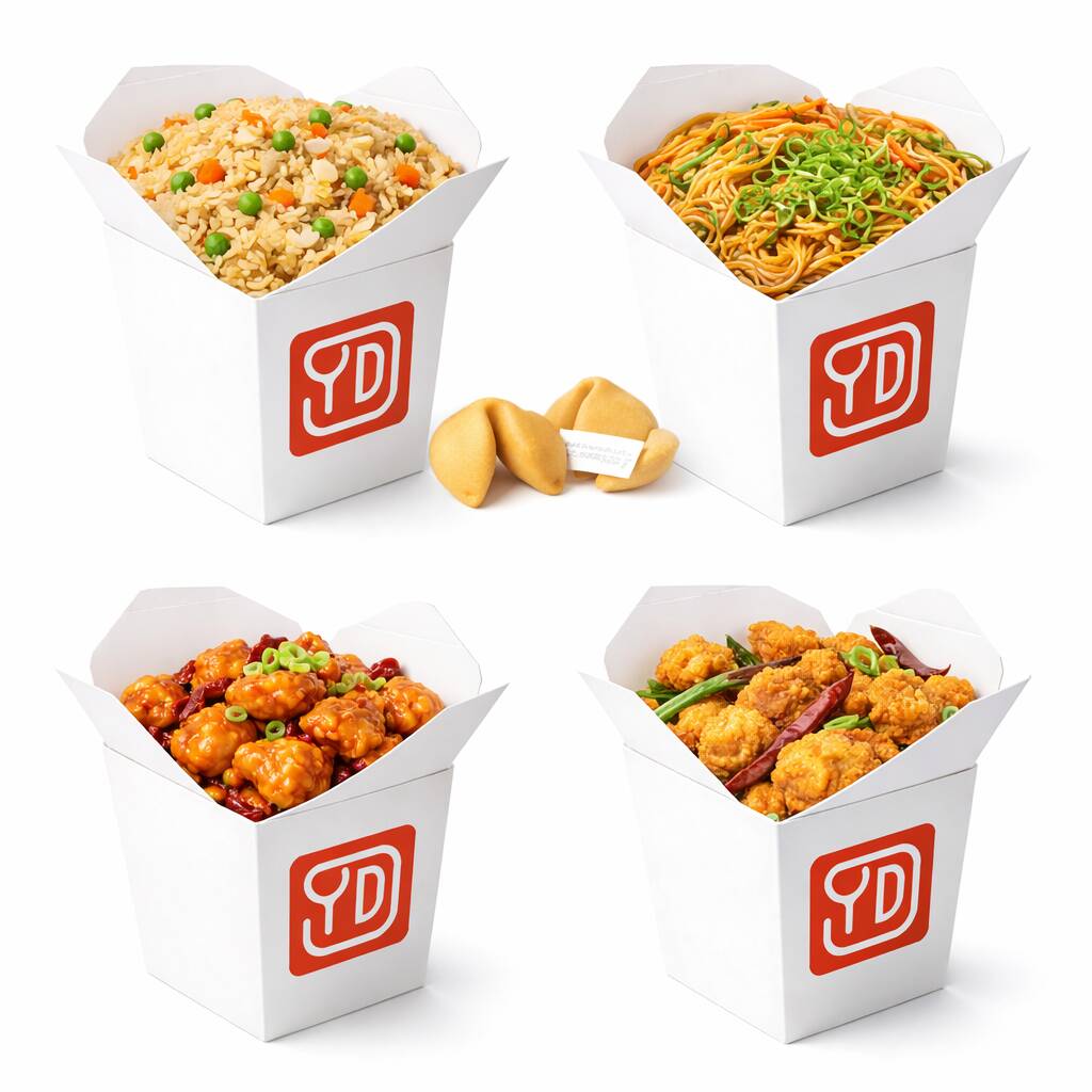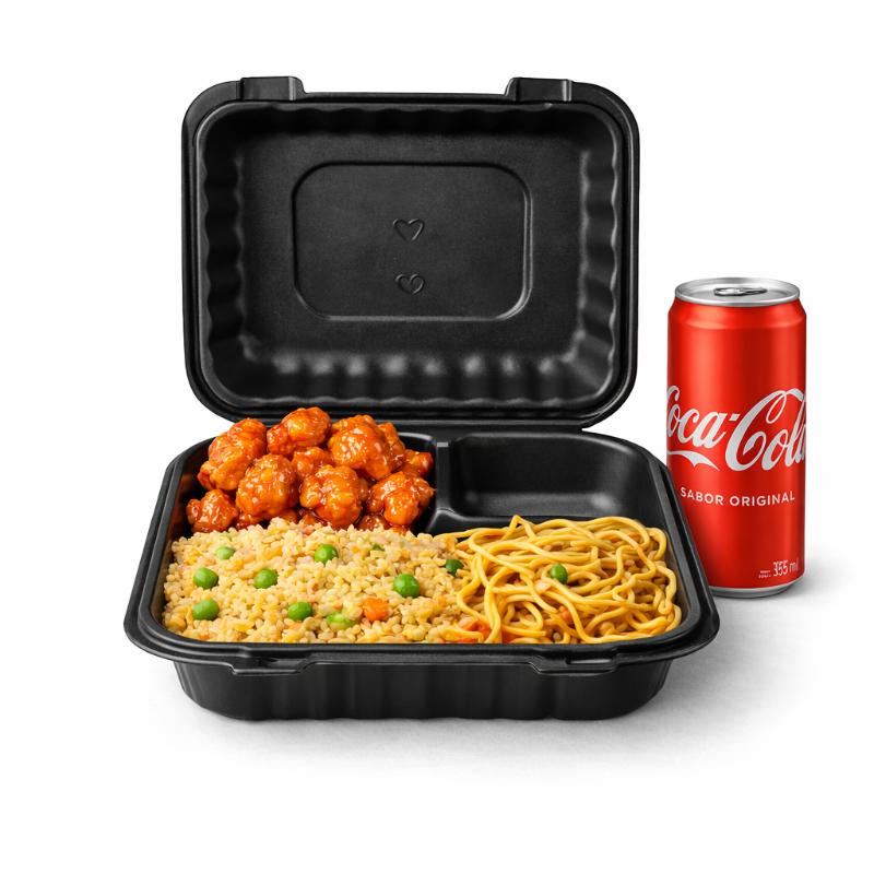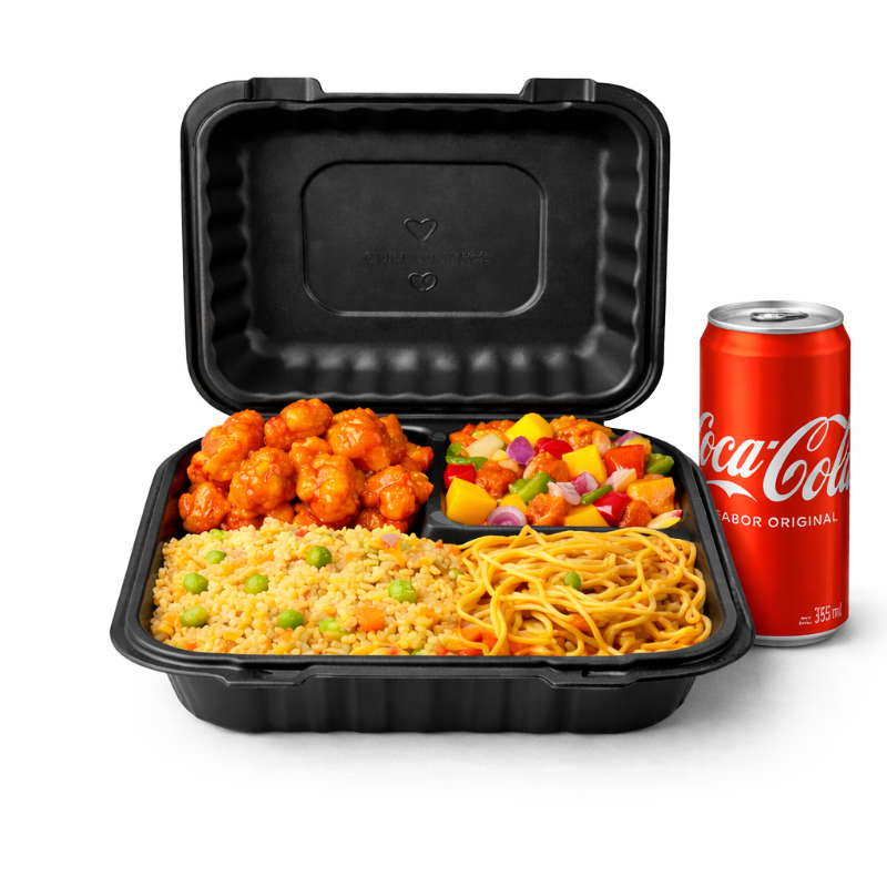 Para la familia: incluye 2 boxes de platillos y 2 de complementos, ideales para 3 o 4 personas, más 4 galletas de la suerte.