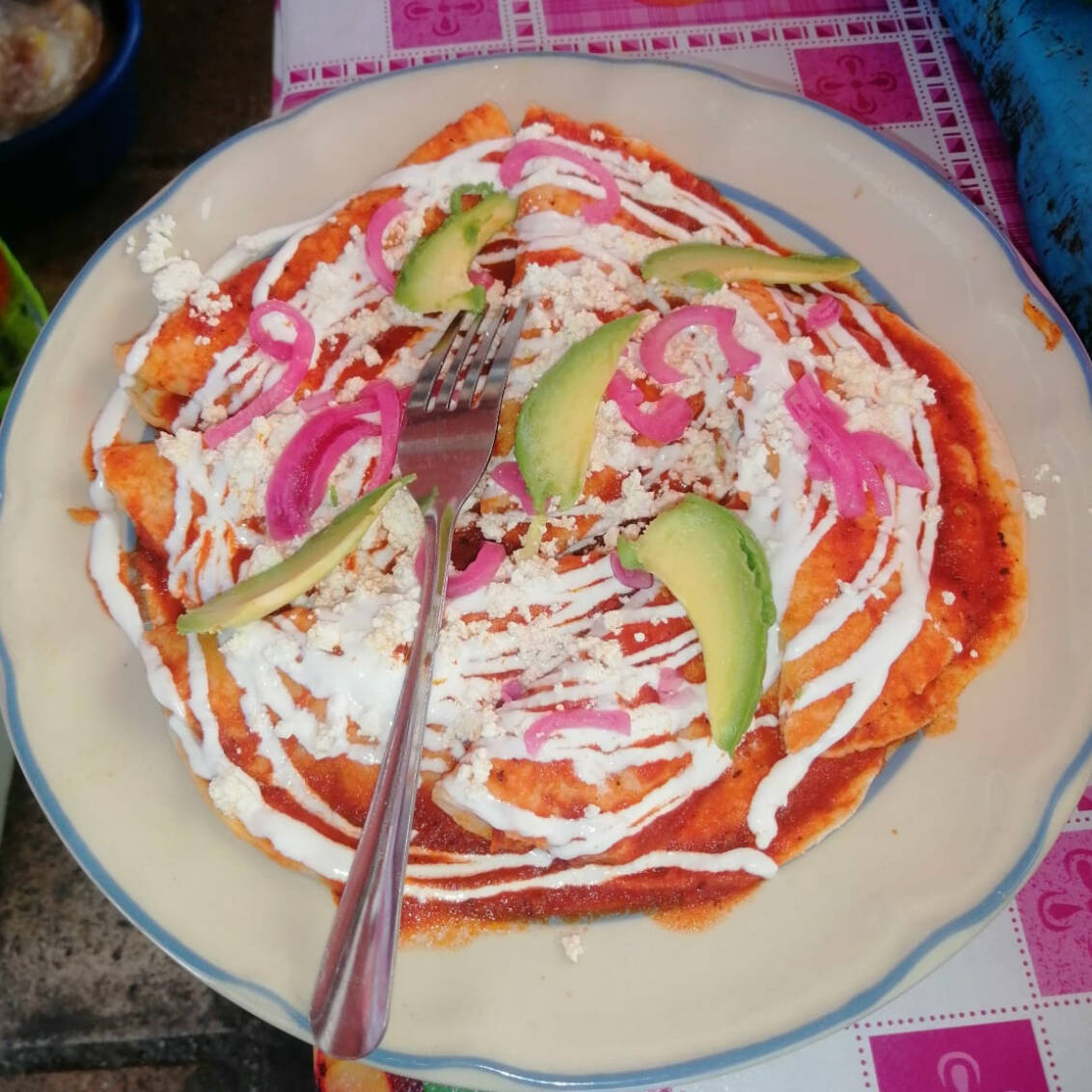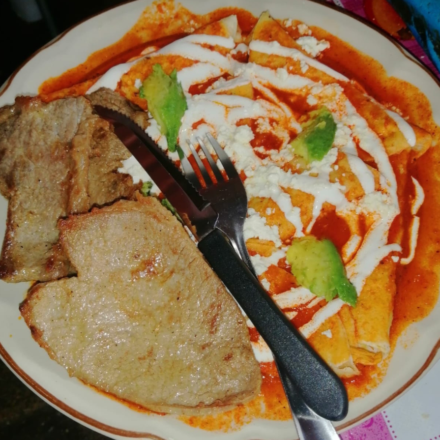 Tortillas rellenas bañadas en salsa picante con queso y guarnición.