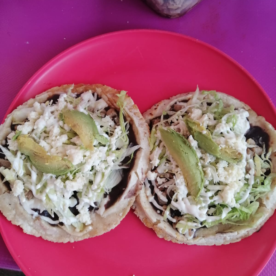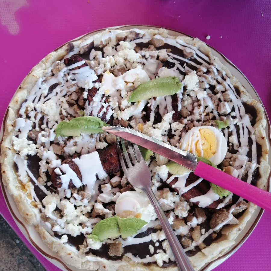 Memela preparada con carne de cerdo asada a la plancha y aderezos tradicionales.
