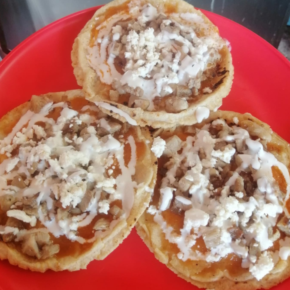 Tortilla gruesa con bordes pellizcados, bañada en salsa y cubierta con carne y queso.