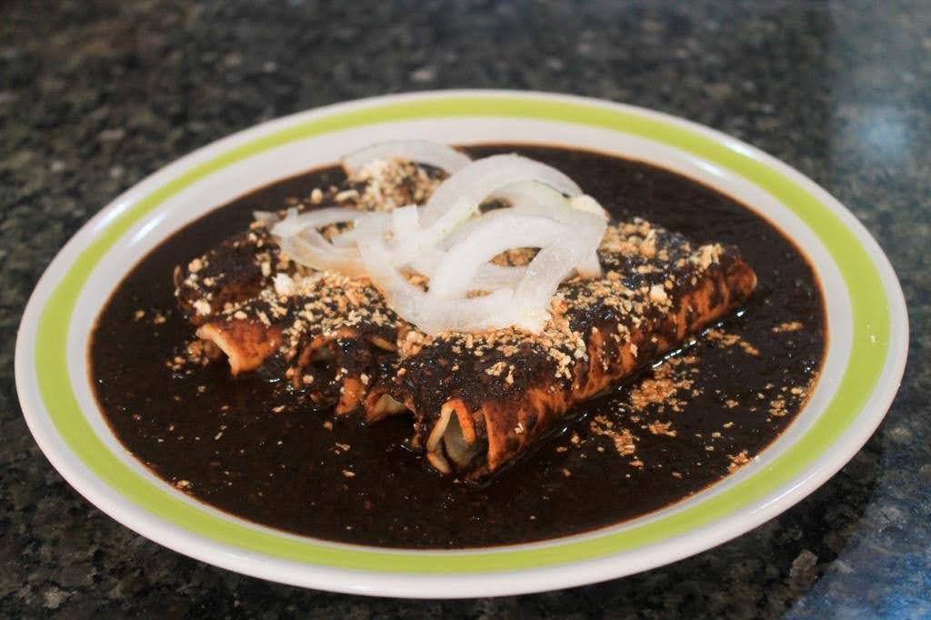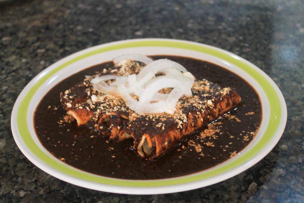 Preparado con tomate, cebolla y chile, acompañado de arroz y frijoles.