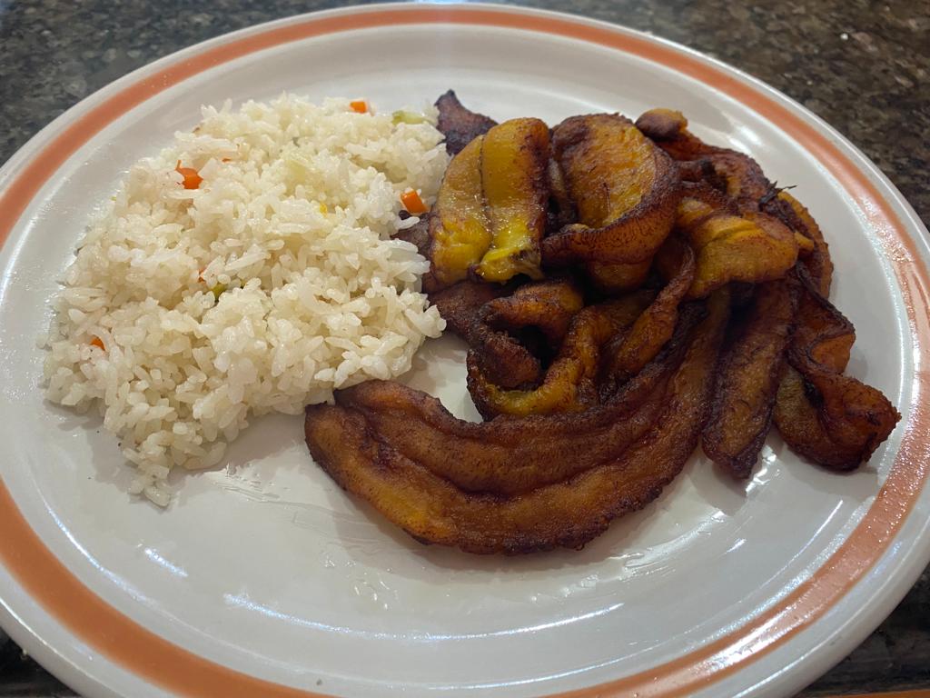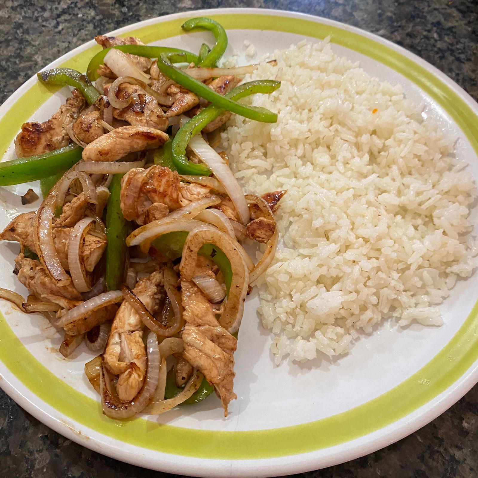Tiras de Pechuga de Pollo guisadas a la plancha con pimiento morron, cebolla y acompañadas con arroz y frijol