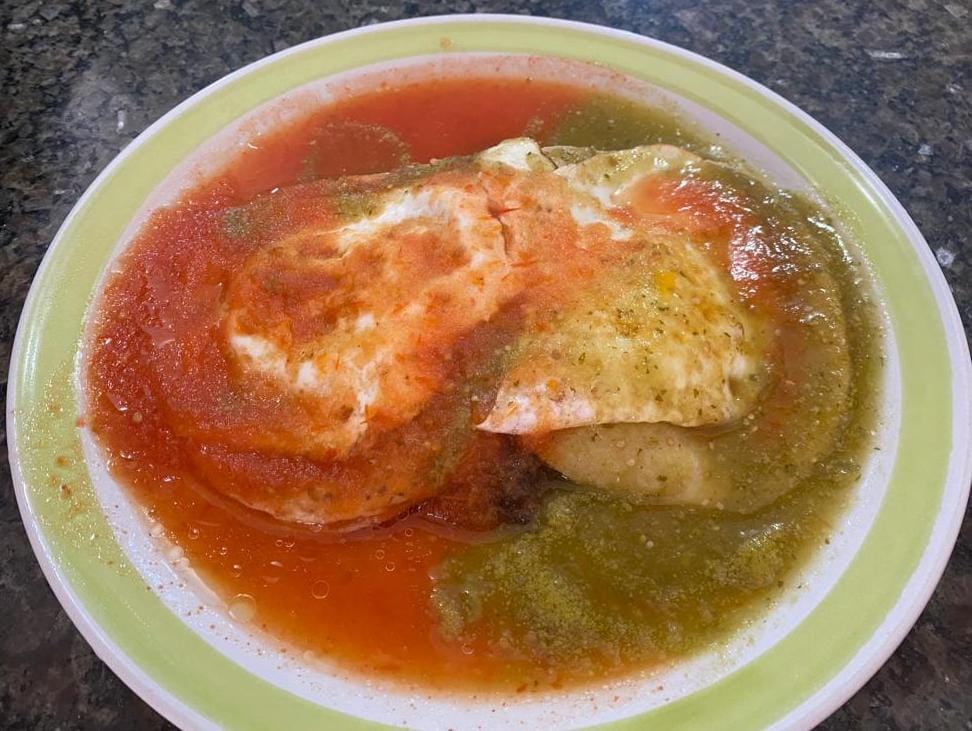 Huevos a la plancha montados sobre tortillas y frijoles bañada en dos salsas verde y roja