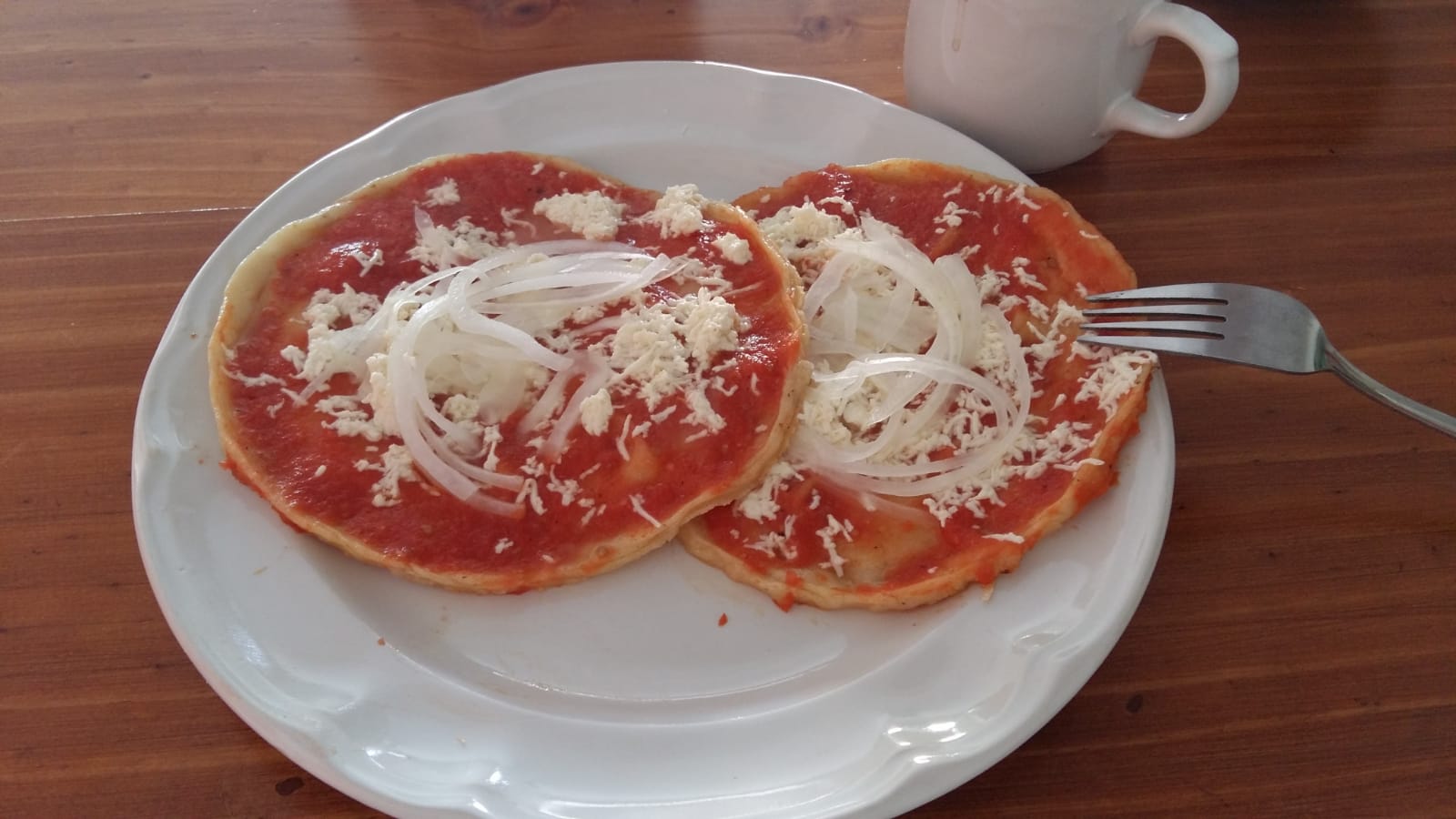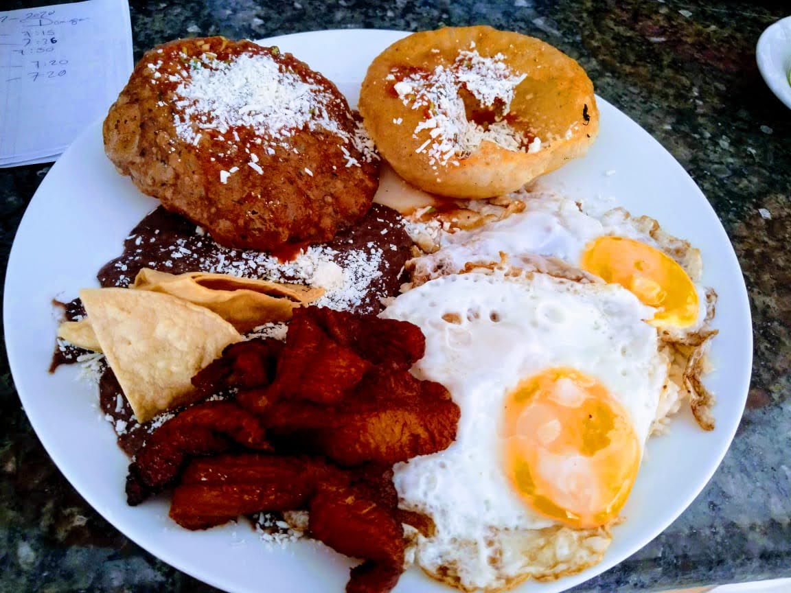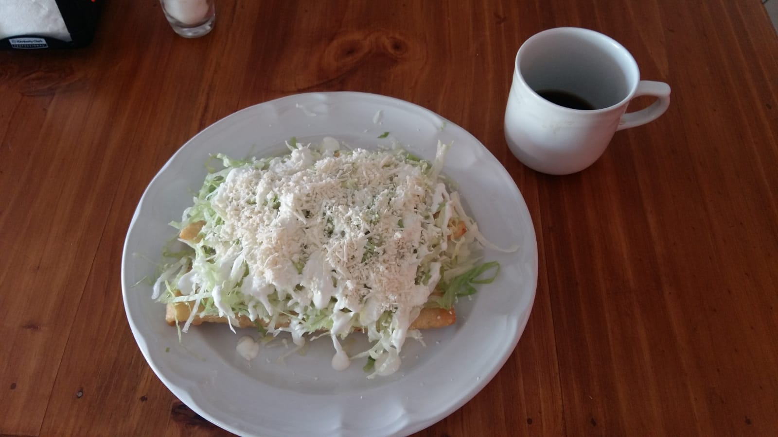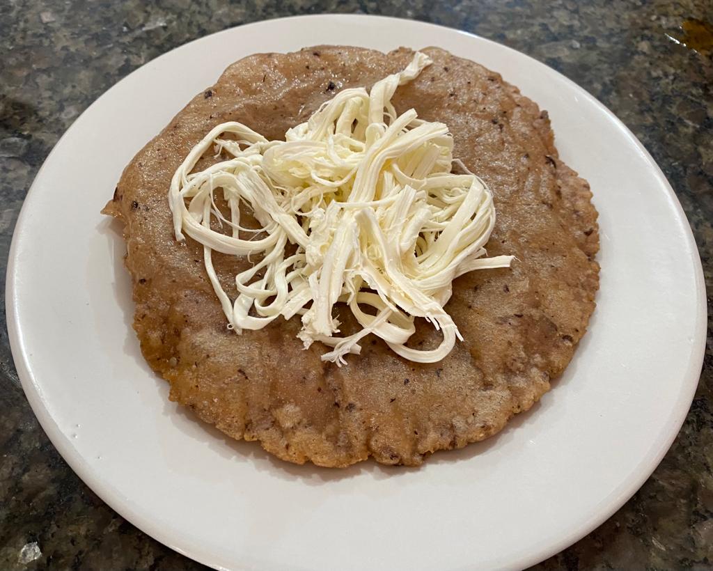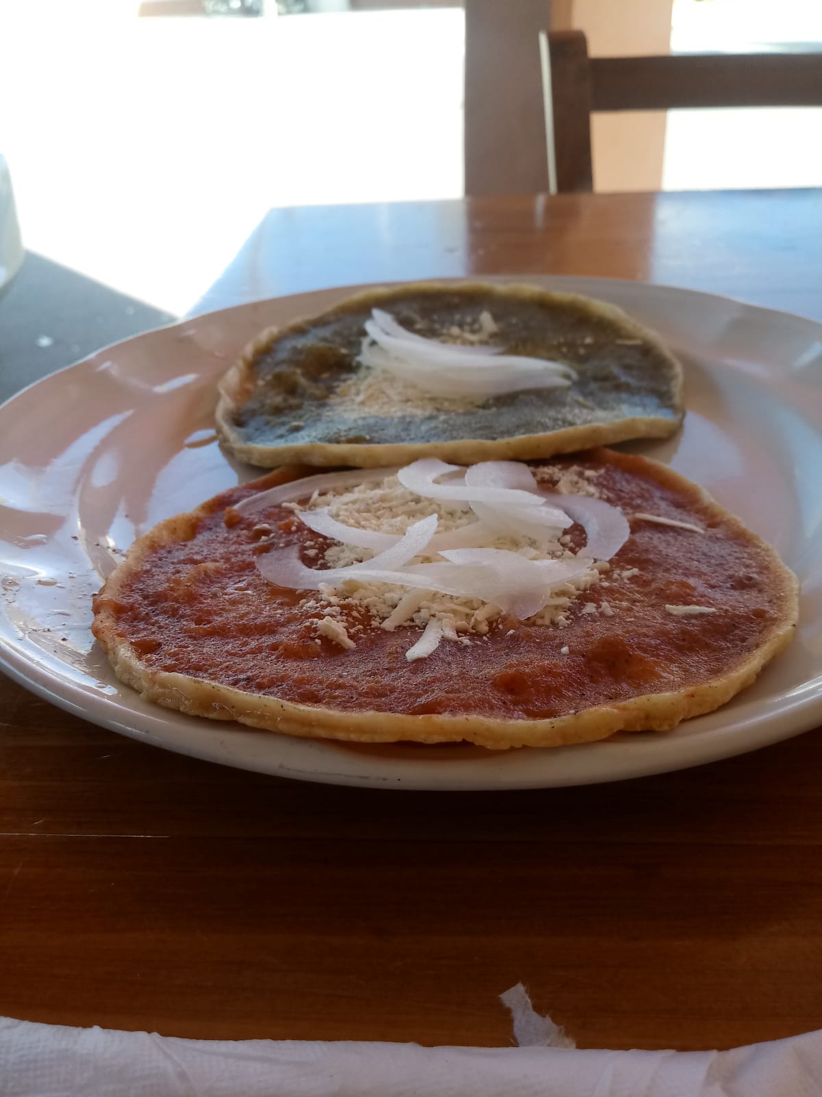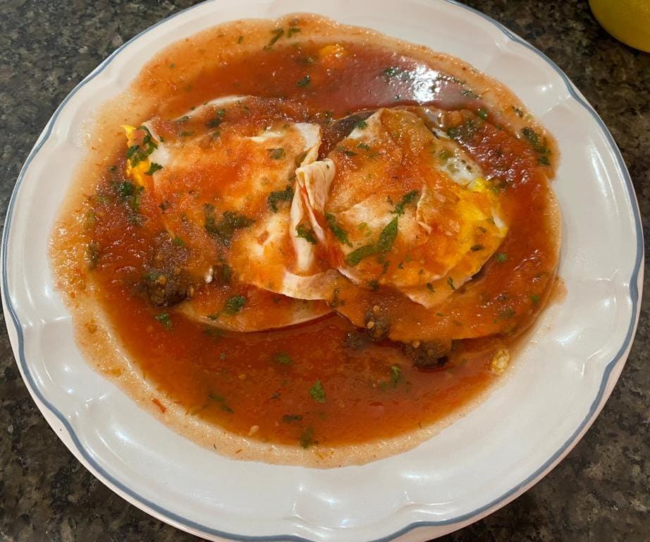 Tortilla doble frita untada con frijoles y coronada con dos huevos fritos y salteadas con salsa de tomate roja