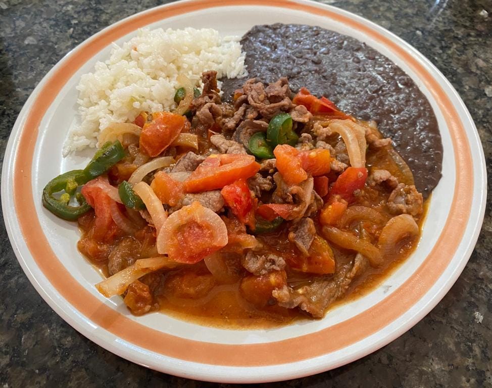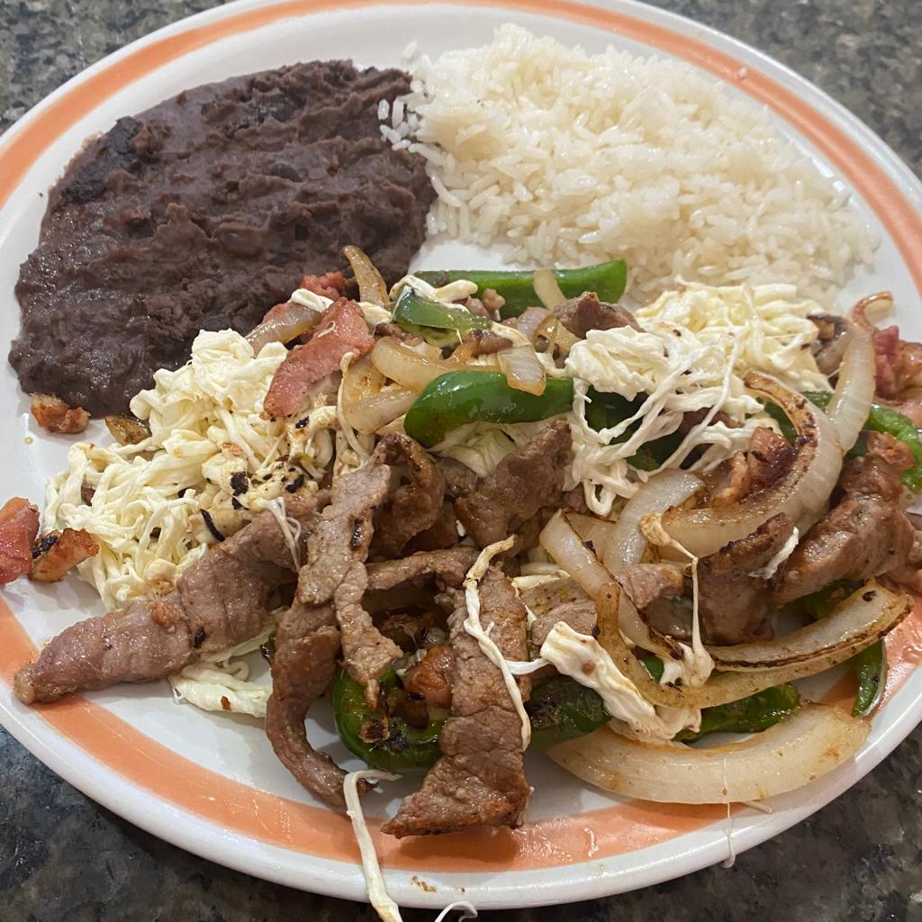 Tiras de bisteck guisadas a la plancha con pimiento morron, cebolla, tocino, queso de hebra acompañado con Arroz y Frijol