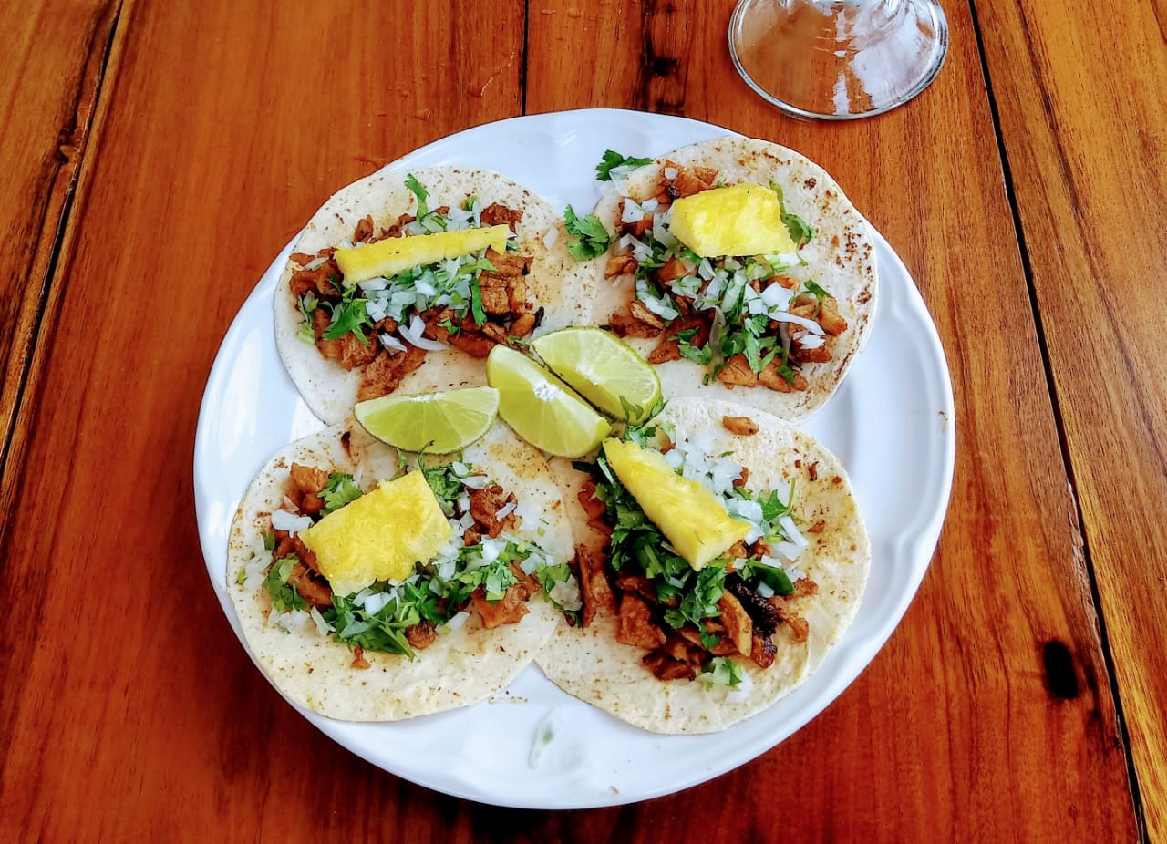 Carne de cerdo al pastor montada sobre una tortilla y acompañada con piña, cebolla y cilantro finamente picado