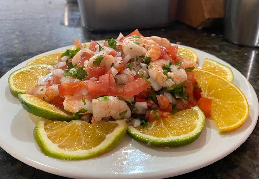 Camarones marinados con jugo de limón y acompañados con Cebolla, tomate y cilantro finamente picado
