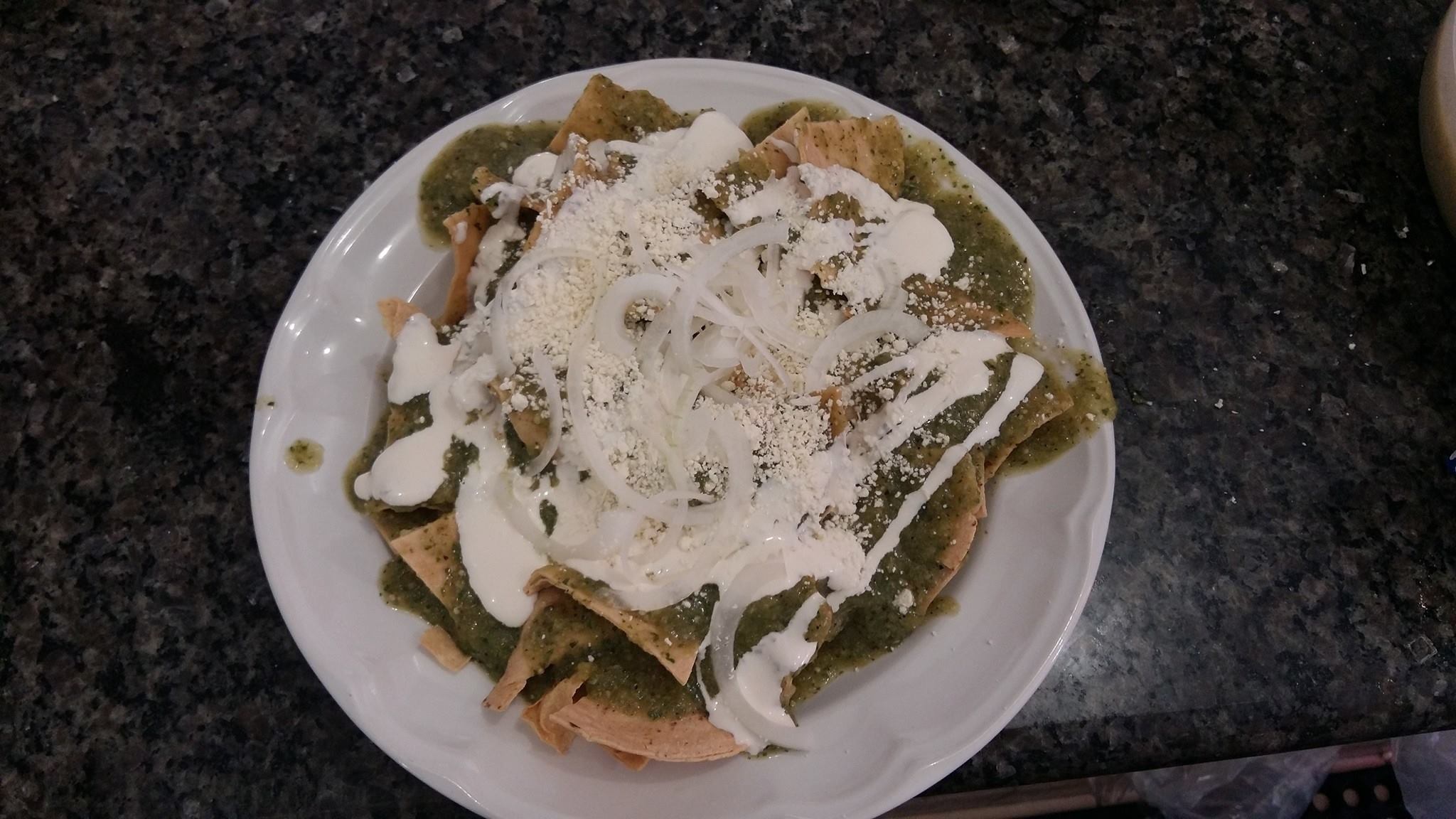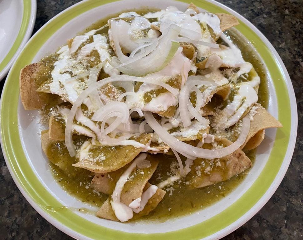 Totopos salteados en salsa de tomate verde acompañados con cebolla, crema y queso