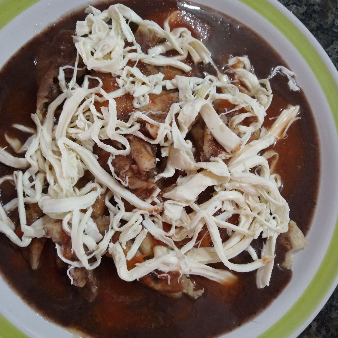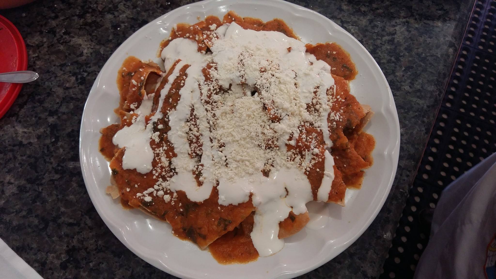Totopos salteados en salsa roja acompañados con cebolla, crema y queso